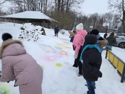 Podczas lekcji plastyki uczniowie klasy IV wraz z wychowawczynią Renatą Romejko uczestniczyli w nietypowych zajęciach artystycznych na świeżym powietrzu. Wykorzystując rozpylacze z kolorową farbą, dzieci tworzyły barwne kompozycje na śniegu. Zajęcia pobudzały wyobraźnię, kreatywność oraz dawały możliwość swobodnej ekspresji twórczej. Uczniowie z dużym zaangażowaniem eksperymentowali z kolorami i kształtami, a lekcja sprawiła im wiele radości. Było to ciekawe połączenie sztuki, zabawy i kontaktu z naturą.